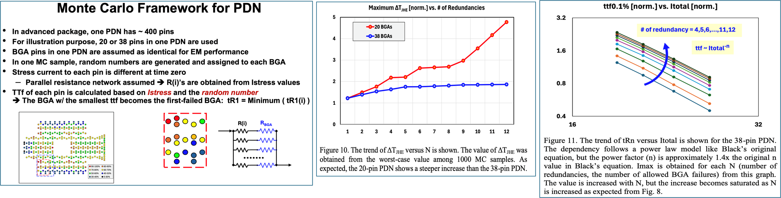 A Monte Carlo methodology that incorporates lognormal variability, parallel resistance networks, and dynamic current redistribution to realistically model EM behavior in power delivery networks (PDNs).